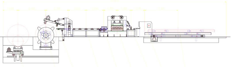 Линия поперечной резки рулонного металла средней толщины состоит из блока разгрузки рулона, двухшпиндельного разматывателя, блока подачи листа, оборудования прессования и прижимания, стола передачи, боковых направляющих, правильной установки, оборудования вывода готовой продукции, кодировщика фиксации длины, гидравлических ножей отрезания, роликового стола, пневматической системы группировки, гидравлической системы, системы электрического контроля и др.