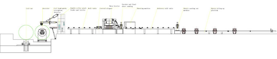 Линия поперечной резки рулонного металла большой толщины состоит из блока подачи рулона, двухшпиндельного разматывателя, направляющей портального типа, прижимного оборудования, блока предварительной правки, стола передачи, боковых направляющих, блока отрезания кромок, блока смотки кромок, основного блока правки, оборудования вывода готовой продукции, кодировщика фиксации длины, гидравлических ножей, стола вывода, пневматического блока группировки, гидравлической системы, систем электроконтроля и др.