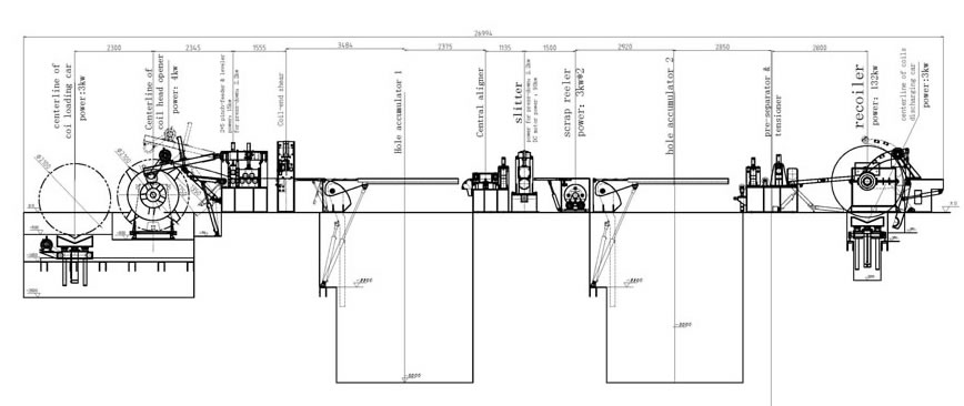 Данная линия продольной резки рулонного металла небольшой толщины предназначена для раскроя листовой стали на небольшие рулоны заданной ширины. Данная линия оснащена блоком загрузки, одношпиндельным разматывателем, блоком обработки кромок, системой двухвалковой подачи, трехвалковым блоком правки листа, механизмом обрезания кромок, блоком выравнивания полосы, дисковыми ножницами, блоком вывода обрезанных кромок, аккумулятором, сепаратором, системой настройки натяжения, блоком опускания рулона, гидравлической системой, блоком электрического контроля.